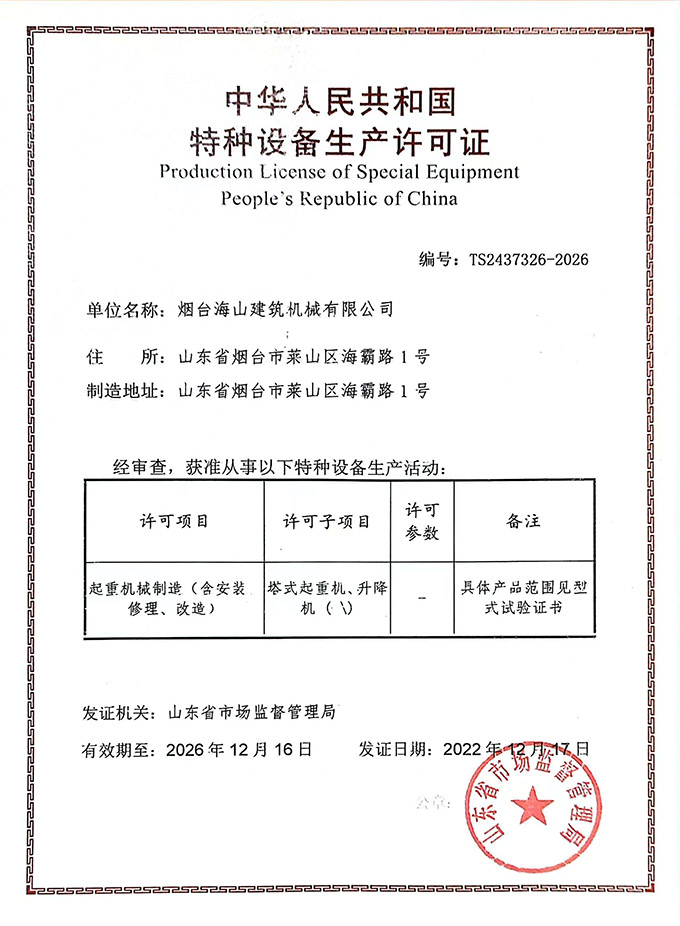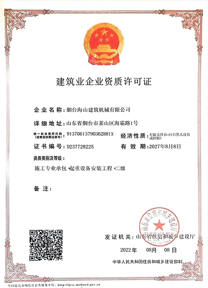 2022年度海山机械的建筑业企业资质许可证书,以及特种设备生产许可证书均通过审批,具体如下图: